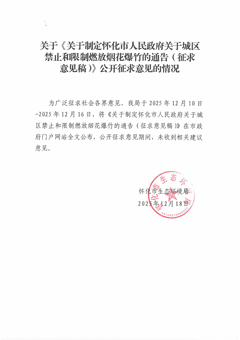 關于《關于城區(qū)禁止和限制燃放煙花爆竹的通告(征求意見稿)》公開征求意見的情況
