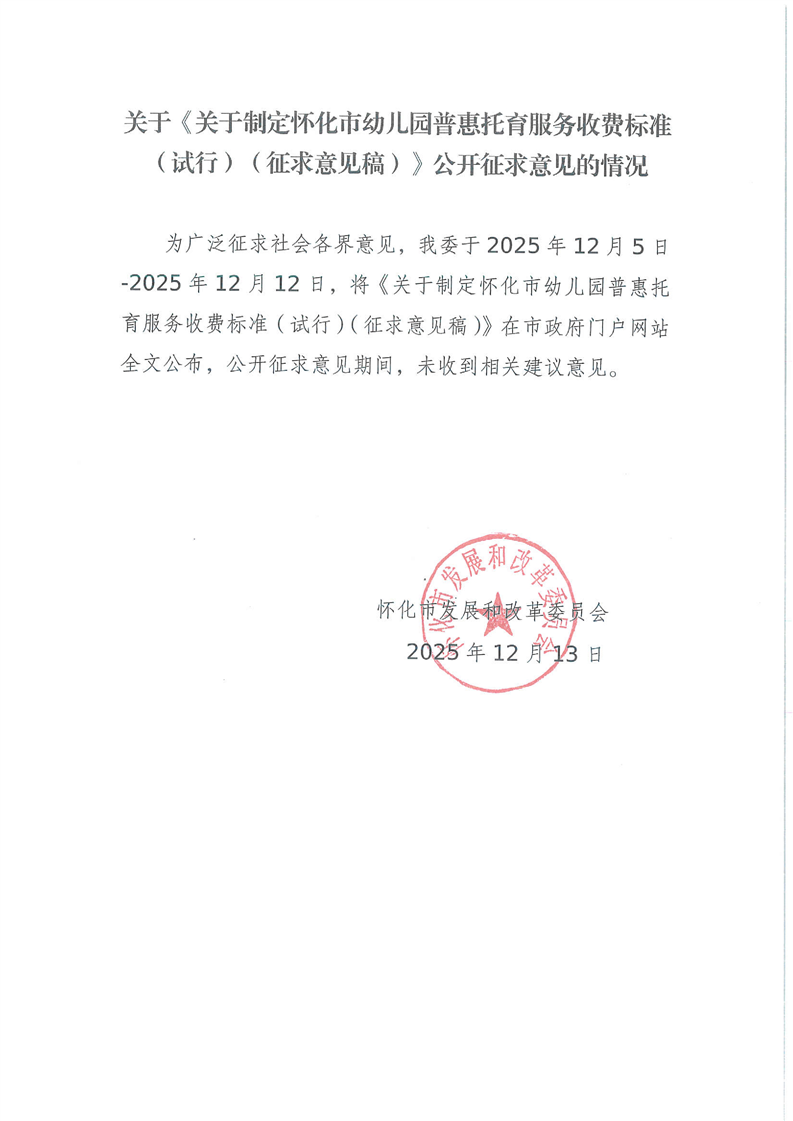 關(guān)于《關(guān)于制定懷化市幼兒園普惠托育服務收費標準(試行)(征求意見稿)》公開征求意見的情況