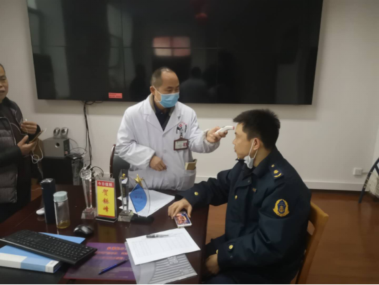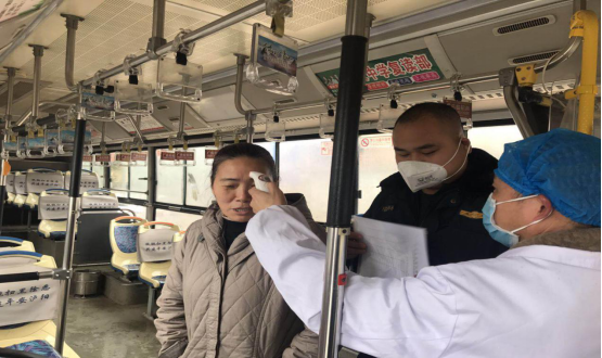 圖一:執(zhí)法人員與衛(wèi)健部門對(duì)公交乘客測體溫