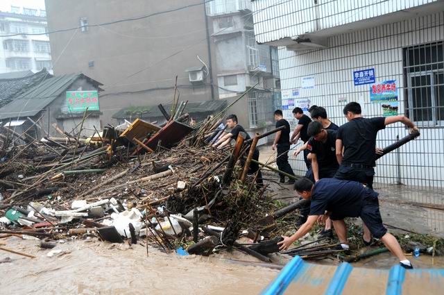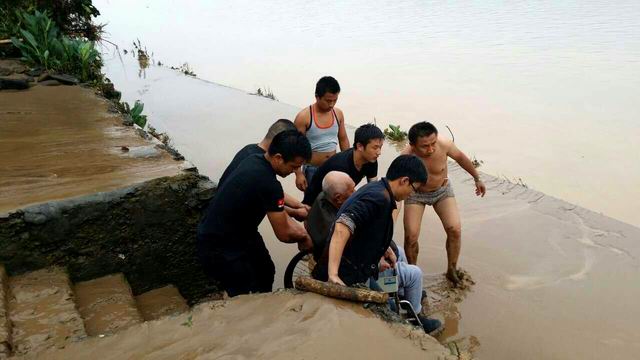 沃溪村一組財(cái)高坪巖屋橋,因橋洞狹窄,被上流沖下來的樹樁、木材、竹竿等雜物堵塞得嚴(yán)嚴(yán)實(shí)實(shí),形成堰塞湖,壓力巨大,如若不及時疏通,險情將進(jìn)一步升級。救援民警一面聯(lián)系挖機(jī)前來協(xié)助救援,一面與洪流“肉搏”,一點(diǎn)一點(diǎn)艱難地將堵塞物移除,疏通排水橋洞泄洪。寧鄉(xiāng)鋪村交溪口組,防洪堤突然潰壩,來不及撤離的30多戶村民被突如其來的洪流圍困,在孤島迫切等待救援,情況萬分危急。救援民警趟過湍急的洪流,挨家挨戶通知并轉(zhuǎn)移被困村民。獨(dú)居的癱瘓老人楊大爺也在民警的幫助下得以安全轉(zhuǎn)移。