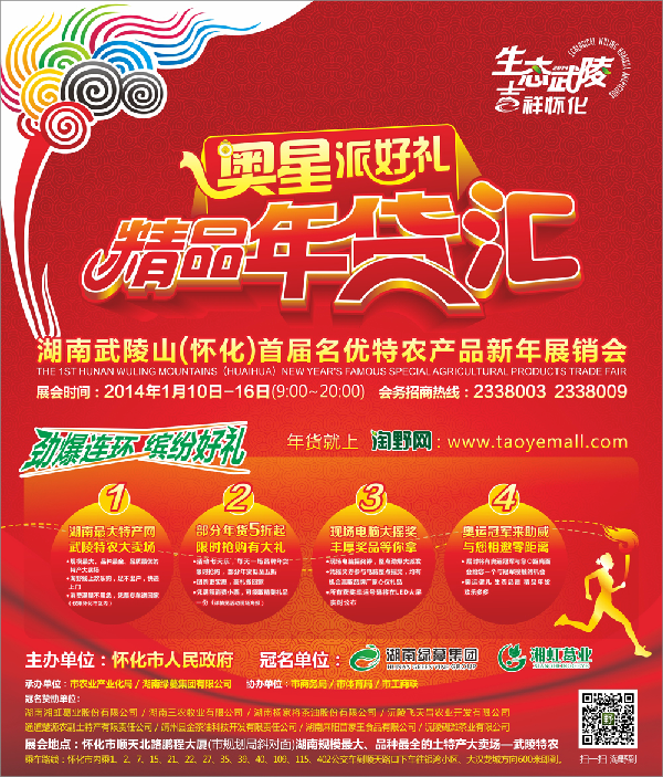 2014湖南武陵山(懷化)首屆名優(yōu)特農(nóng)產(chǎn)品新年展銷會期間市民免費入場,全場特賣低至5折,滿三百還有神秘禮品相送,持抽獎券可搖獎。