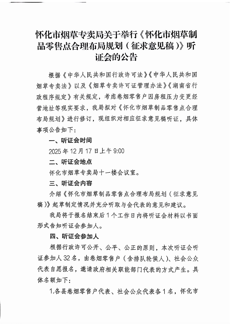 懷化市煙草專賣局關(guān)于舉行《懷化市煙草制品零售點(diǎn)合理布局規(guī)劃(征求意見(jiàn)稿)》聽(tīng)證會(huì)的公告