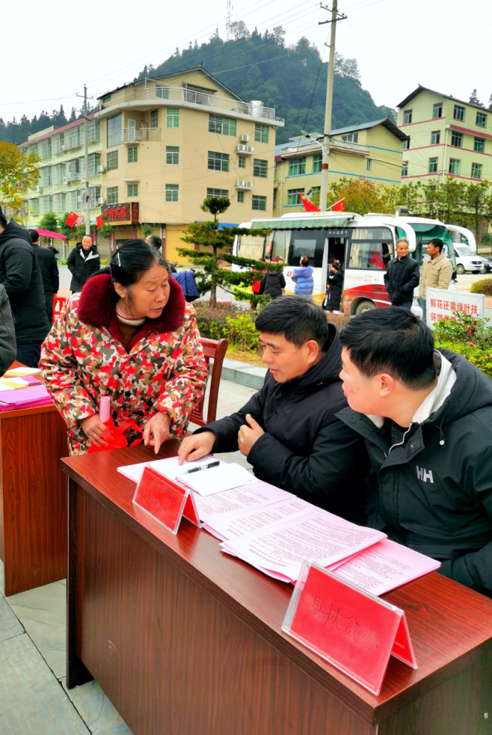 2020年1月13日在會同縣漠濱侗族苗族鄉(xiāng)三下鄉(xiāng)活動現(xiàn)場,工作人員正在為群眾解答扶貧政策。