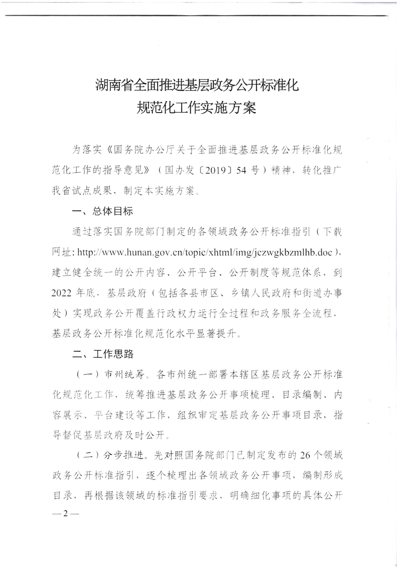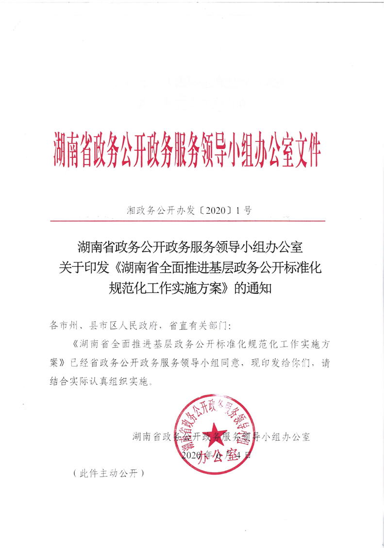 湖南省政務(wù)公開政務(wù)服務(wù)領(lǐng)導(dǎo)小組辦公室關(guān)于印發(fā)《湖南省全面推進基層政務(wù)公開標(biāo)準(zhǔn)化規(guī)范化工作實施方案》的通知(湘政務(wù)公開辦發(fā)〔2020〕1號)