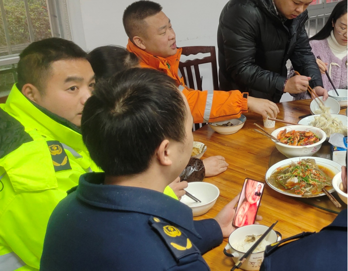 17時(shí),訓(xùn)練剛剛結(jié)束,食堂里就飄來(lái)了飯菜香,隊(duì)員們才想起:“今天是年夜飯加餐啊,趕緊去洗澡!”隊(duì)員們脫去作訓(xùn)服,豆大的汗珠還掛在額頭就往宿舍跑去。不一會(huì)兒,管理所里的同事紛紛來(lái)到食堂,圍坐在一起。第一件事竟然是不約而同地拿出手機(jī),有拍照發(fā)朋友圈的,更多是與家人視頻通話。