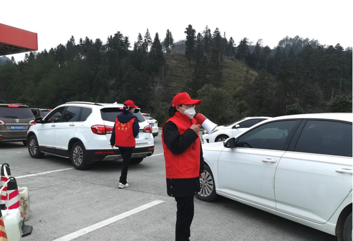 (“路燈”志愿者在通道服務區(qū)加油站引導車輛有序通行。)