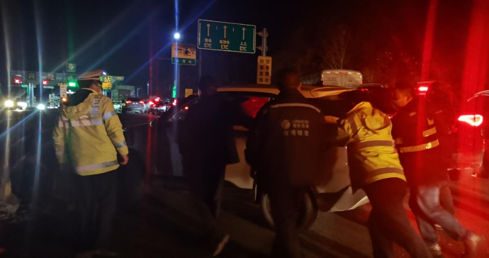 (一輛小車在興隆收費站故障,工作人員合力將車輛推至安全區(qū)域。)