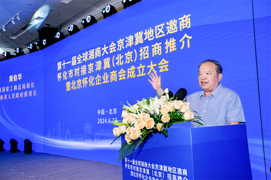 6月23日下午,第十一屆全球湘商大會(huì)京津冀地區(qū)邀商、懷化市對(duì)接京津冀(北京)招商推介暨北京懷化企業(yè)商會(huì)成立大會(huì)在北京舉行。圖為原國(guó)家工商總局局長(zhǎng)、湖南省政府原省長(zhǎng)周伯華出席并講話。(懷化日?qǐng)?bào)全媒體記者 潘雨 攝)