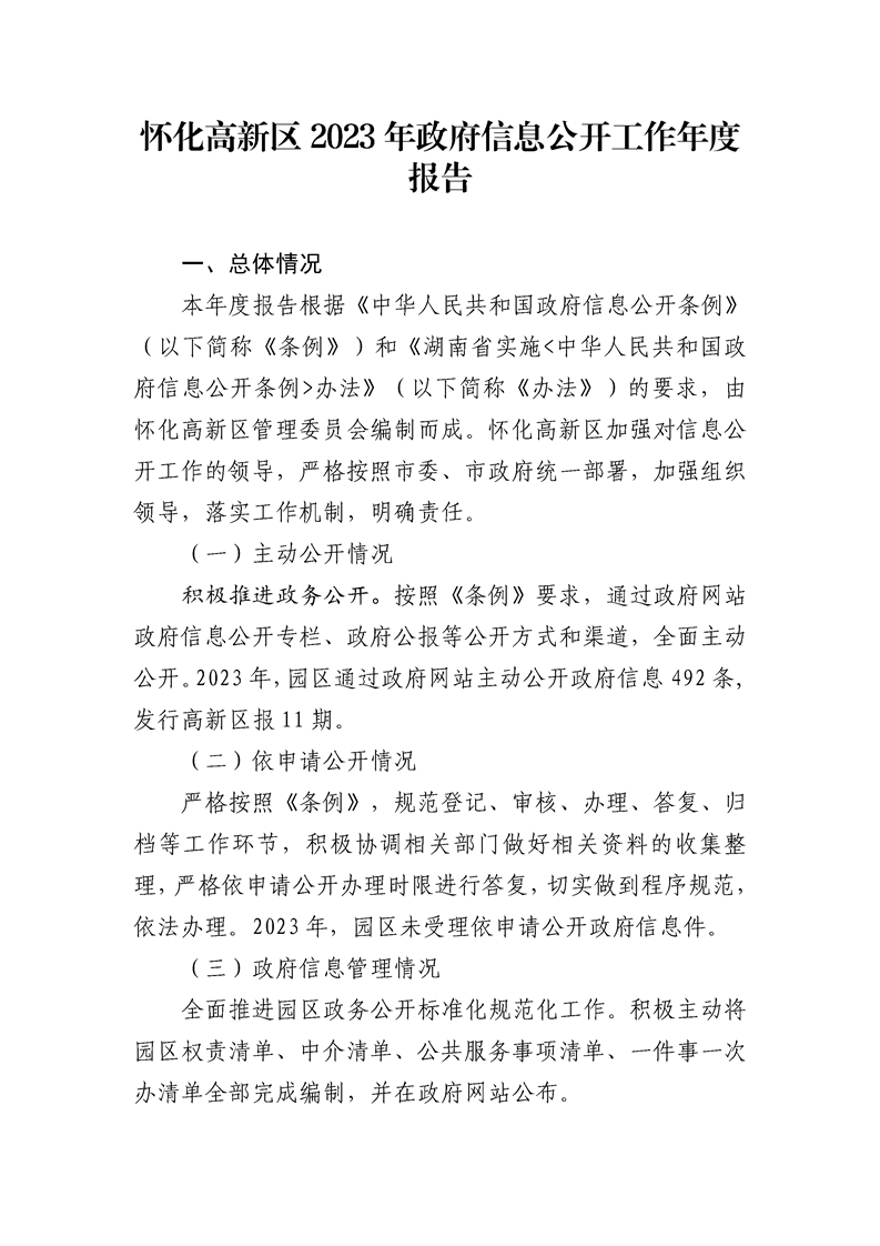 懷化高新區(qū)2023年政府信息公開工作年度報告